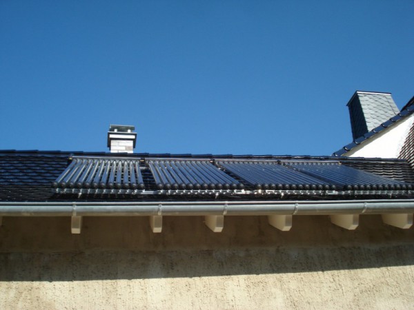 Direkt durchströmte Röhrenkollektoren mit dem Anschlussgehäuse oben. "Nur zur Aufdachmontage geeignet."
